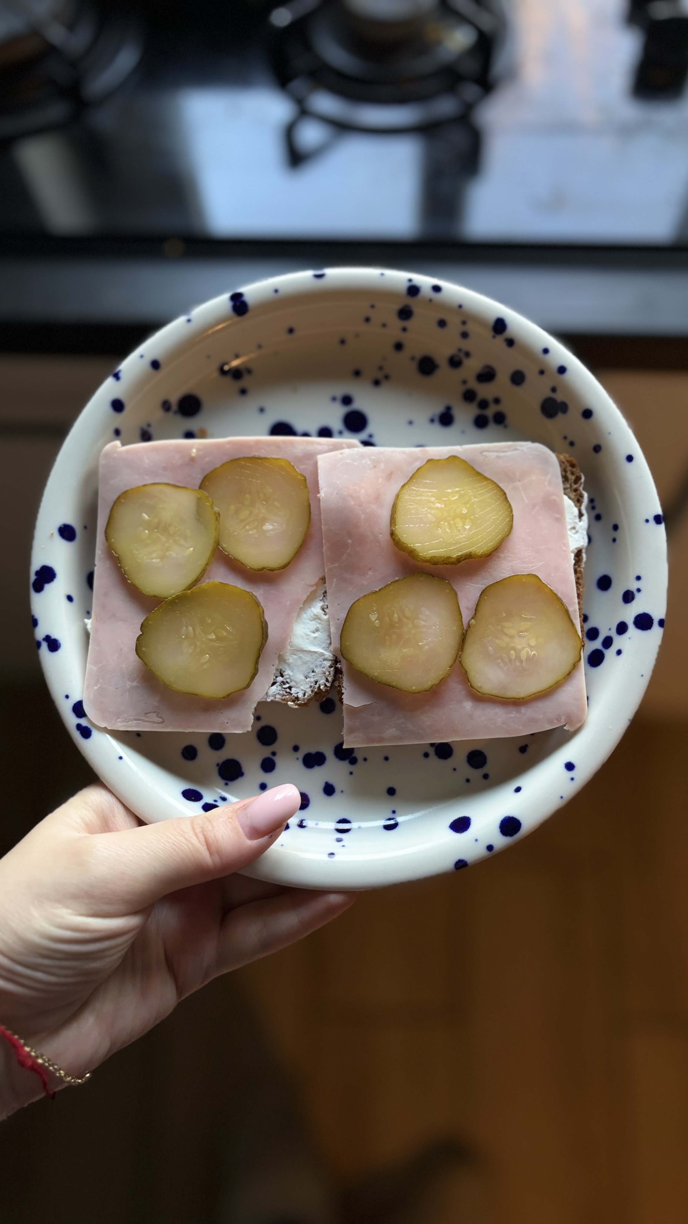 . Żytni chlebek, Almette, szyneczka i kiszony ogórek ![]()