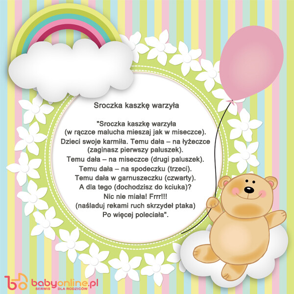 Tak szczególnie te stare rymowanki ja nie raz gryzę zsie w język i przekręcam na inny tekst np tu sroczka kaszke ważyła tu sobie ogonek sparzyła temu dała.... A temu ukręciła łebek i do nieba po kawałek chleba poleciala"