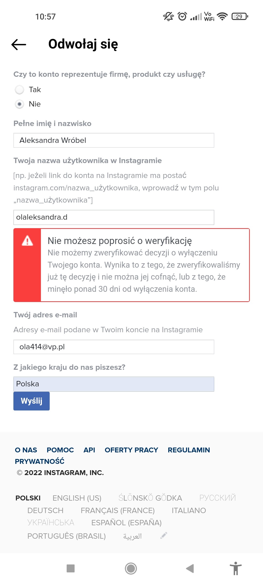 Najpierw zablokowali mi konto na IG, była weryfikacja a teraz mam info że konto zostało usunięte na zawsze bo narusza zasady prywatności.... Da się to jeszcze jakoś uratować? Można jakoś odzyskać konto czy już wszystko przepadło? :(
