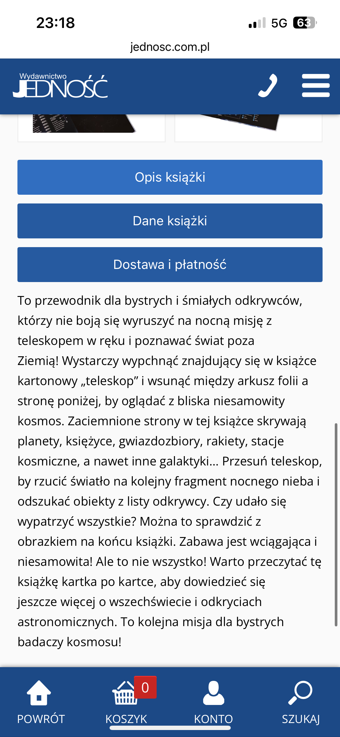 To przewodnik dla bystrych i śmiałych odkrywców, którzy nie boją się wyruszyć na nocną misję z teleskopem w ręku i poznawać świat poza Ziemią! Wystarczy wypchnąć znajdujący się w książce kartonowy „teleskop” i wsunąć między arkusz folii a stronę poniżej, by oglądać z bliska niesamowity kosmos. Zaciemnione strony w tej książce skrywają planety, księżyce, gwiazdozbiory, rakiety, stacje kosmiczne, a nawet inne galaktyki… Przesuń teleskop, by rzucić światło na kolejny fragment nocnego nieba i odszukać obiekty z listy odkrywcy. Czy udało się wypatrzyć wszystkie? Można to sprawdzić z obrazkiem na końcu książki. Zabawa jest wciągająca i niesamowita! Ale to nie wszystko! Warto przeczytać tę książkę kartka po kartce, aby dowiedzieć się jeszcze więcej o wszechświecie i odkryciach astronomicznych. To kolejna misja dla bystrych badaczy kosmosu!