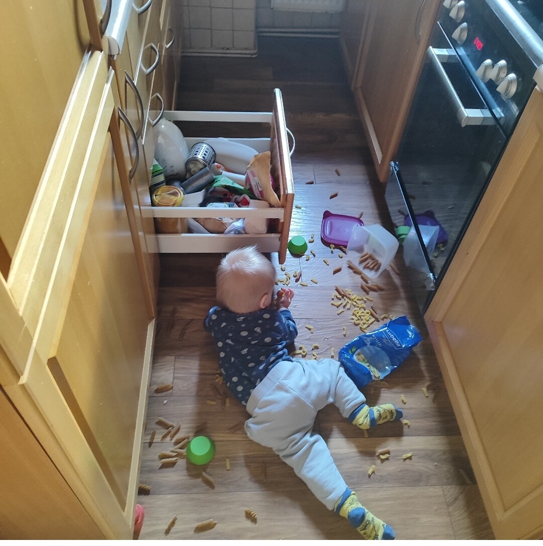 Przywiązane zabawki do sznurka i zachęcenie dzieciaczka żeby za nim raczkowało, budowanie wieży i pozwalanie żeby dziecko je burzyło, naklejanie kolorowych kartek na ścianę czy mebel i zachęcenie dziecka żeby je odklejało, przygotowanie miski z wodą i wrzucenie do nich kulek, albo z piaskiem i powrzucanie do nich różnych zwierzątek, zabawy z tablicą manipulacyjną czy po prostu czytanie dziecku jakiś książeczek i żeby za nami powtarzało jakieś proste słowa.
